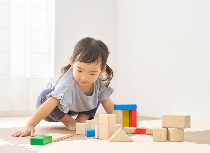 さまざまな形や素材に触れて遊ぶことで、子どもは大人が想像できないひらめきであそびを作り出そうとします。